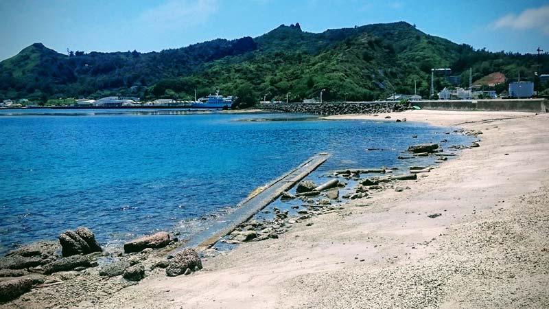 今の時期、干潮の時間帯になると二見岩付近の珊瑚礁が海面上に現れます。海岸には戦争中の遺構が見えます。